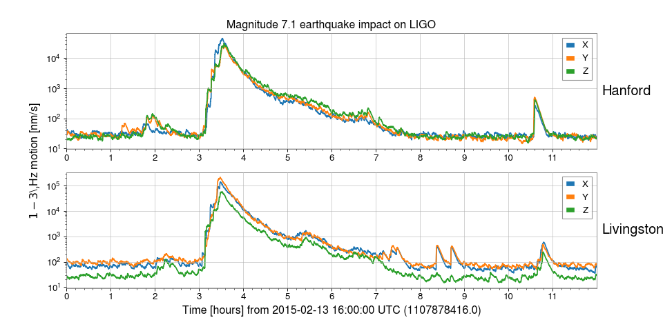As we can see, the earthquake had a huge impact on the LIGO observatories, severly imparing operations for several hours.